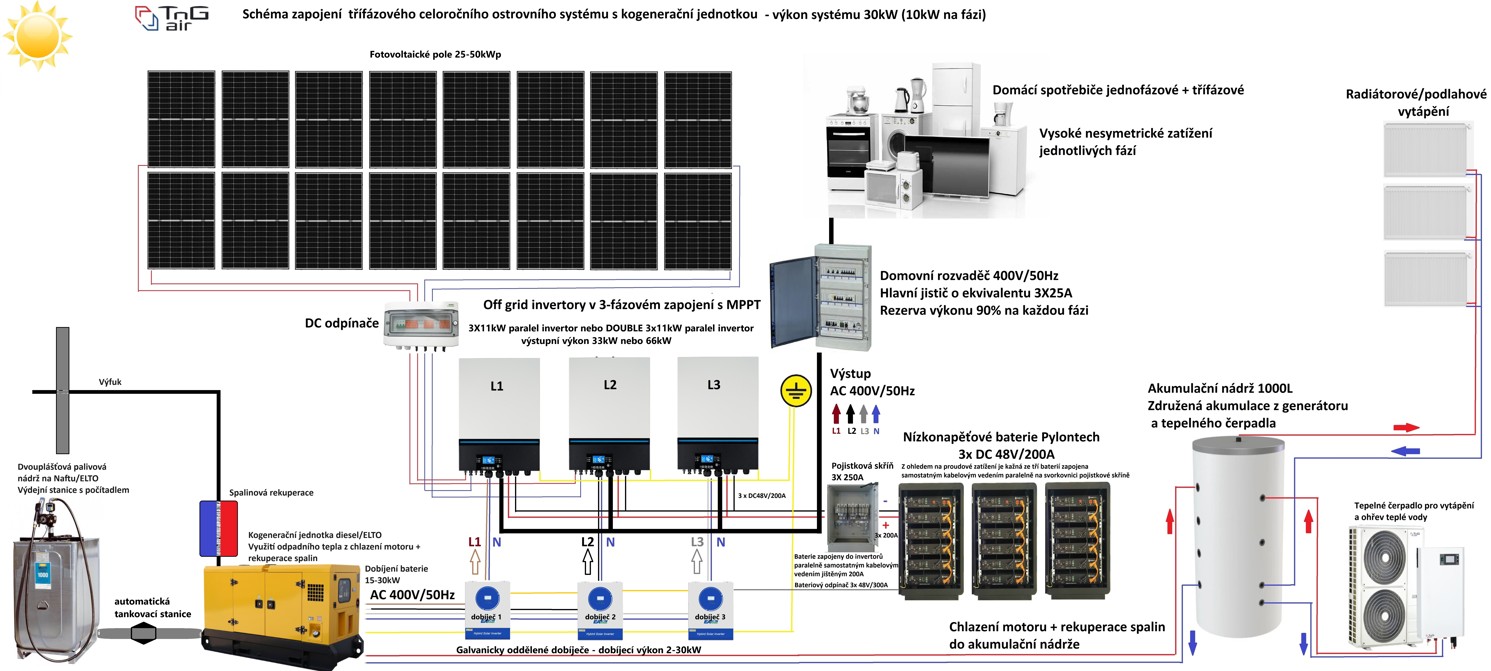 Určeno pro dvougenerační rodinný dům s celoročním provozem bez omezení. Uživatelsky pro náročnou domácnost s 3-fázovým rozvodem. Provoz stejný, jako v případě připojení na veřejnou síť s hodnotou hlavního jističe 3X32A. Uživatel není ničím omezen. Elektrické vaření, pračka + myčka nádobí, 3-fázové elektrické nářadí, vytápění tepelným čerpadlem atd.